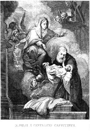 San Felice Porro da Cantalice (1515-1587), laico. Tale stampa è ascrivibile all'iconografia dei secoli XVIII e XIX. Il soggetto iconografico è dato dalla visione di Gesù Bambino, tema che diverrà dominante nelle chiese cappuccine di questo periodo. |