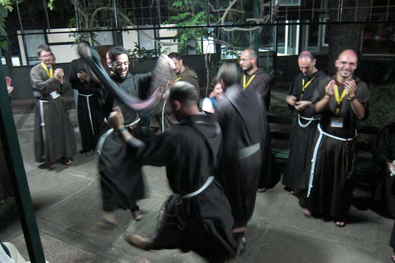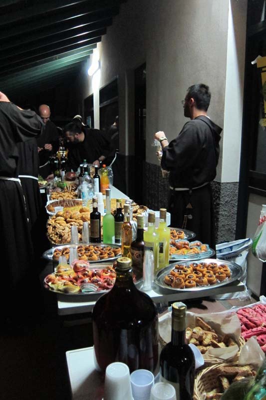La degustazione regionale, nel parco del Santuario, con i prodotti tipici portati dalle varie case formative riscuote nuovamente l’atteso successo: vini, dolci, pizze e salsicce… e molto altro ancora: sapori dall’Italia. In chiusura balli e canti e cingoli francescani al passo di danza.