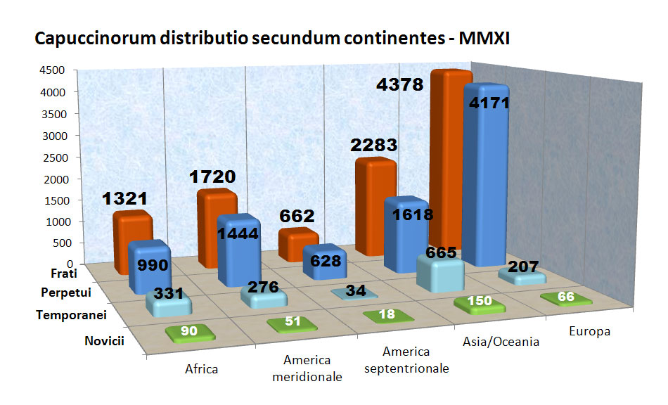 L’ultima statistica pubblicata dalla Curia generale dei Cappuccini, presenta la consistenza numerica dei Cappuccini nel mondo e la loro distribuzione nei continenti. I frati Cappuccini, al 1° gennaio 2012, sono 10.364.