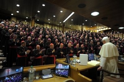 è un momento di grazia questo vostro annuale convenire in Assemblea, in cui vivete una profonda esperienza di confronto, di condivisione e di discernimento per il comune cammino, animato dallo Spirito del Signore Risorto; è un momento di grazia che manifesta la natura della Chiesa. Ringrazio il Cardinale Angelo Bagnasco per le cordiali parole con cui mi ha accolto, facendosi interprete dei vostri sentimenti: a Lei, Eminenza, rivolgo i migliori auguri per la riconferma alla guida della Conferenza Episcopale Italiana. L’affetto collegiale che vi anima nutra sempre più la vostra collaborazione a servizio della comunione ecclesiale e del bene comune della Nazione italiana, nell’interlocuzione fruttuosa con le sue istituzioni civili. In questo nuovo quinquennio proseguite insieme il rinnovamento ecclesiale che ci è stato affidato dal Concilio Ecumenico Vaticano II; il 50° anniversario del suo inizio, che celebreremo in autunno, sia motivo per approfondirne i testi, condizione di una recezione dinamica e fedele. «Quel che più di tutto interessa il Concilio è che il sacro deposito della dottrina cristiana sia custodito e insegnato in forma più efficace», affermava il Beato Papa Giovanni XXIII nel discorso d’apertura. E vale la pena meditare e leggere queste parole. Il Papa impegnava i Padri ad approfondire e a presentare tale perenne dottrina in continuità con la tradizione millenaria della Chiesa: «trasmettere pura ed integra la dottrina, senza attenuazioni o travisamenti», ma in modo nuovo, «secondo quanto è richiesto dai nostri tempi». (Discorso di solenne apertura del Concilio Ecumenico Vaticano II, 11 ottobre 1962). Con questa chiave di lettura e di applicazione, - nell’ottica non certo di un’inaccettabile ermeneutica della discontinuità e della rottura, ma di un ermeneutica della continuità e della riforma, - ascoltare il Concilio e farne nostre le autorevoli indicazioni, costituisce la strada per individuare le modalità con cui la Chiesa può offrire una risposta significativa alle grandi trasformazioni sociali e culturali del nostro tempo, che hanno conseguenze visibili anche sulla dimensione religiosa.