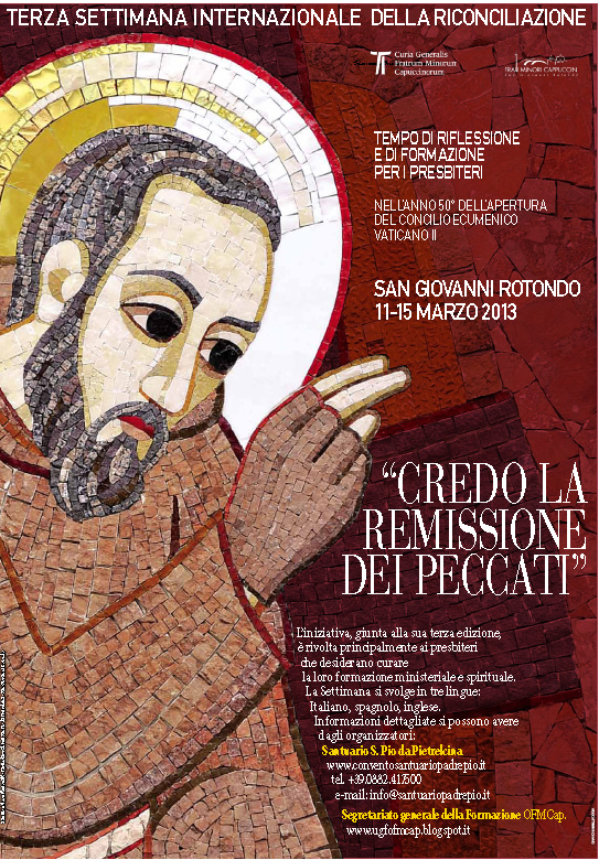 Dall'11 al 15 marzo 2013 si svolgerà la Terza Settimana Internazionale della Riconciliazione che avrà luogo a S. Giovanni Rotondo e avrà per tema: “Credo la remissione dei peccati”. Questo tempo di riflessione e di formazione per i presbiteri, in quest’anno dedicato ad un maggiore approfondimento della nostra fede, vuole spronare a considerare l’articolo del Credo che la Tradizione della Chiesa riferisce al mistero della Misericordia di Dio rigeneratrice e salvifica.
