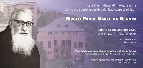 Sabato 31 maggio 2014 alle ore 18.00 presso il complesso di Villa Piuma in Genova Coronata aprirà al pubblico il nuovo spazio espositivo dedicato alla figura carismatica di p. Umile da Genova .
