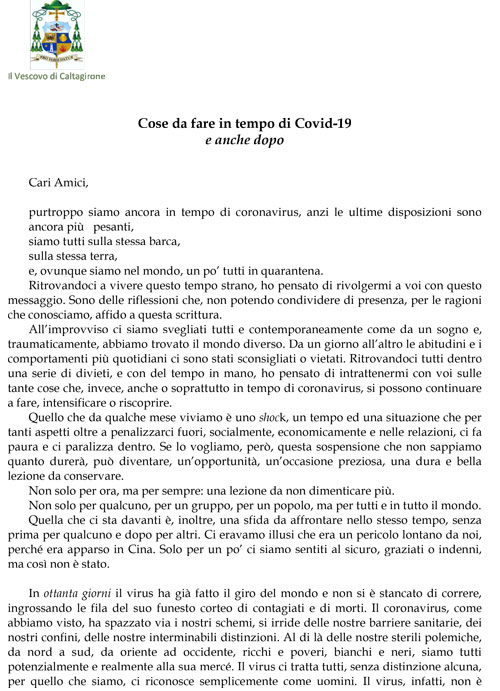 Lettera del Vescovo di Caltagirone ai fedeli per emergenza Coronavirus