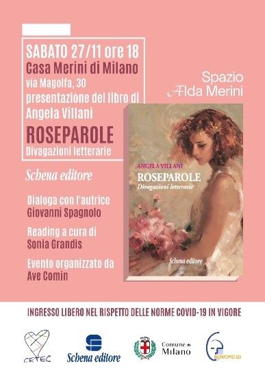 MILANO - Sabato 27 novembre us., nella prestigiosa cornice dello Spazio Alda Merini, ai Navigli, si è svolto un evento culturale assai partecipato: la presentazione dell’ultimo libro della professoressa-scrittrice Angela Villani Roseparole. Divagazioni letterarie, Schena editore, 2021. Dopo il saluto della direttrice dello Spazio Alda Merini, Ave Comin, ha preso la parola fra Giovanni Spagnolo che ha presentato il libro e avviato il dialogo con l’Autrice. Brani del libro sono stati letti, con grande coinvolgimento emotivo, dall’attrice Sonia Grandis.