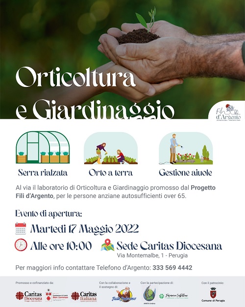 E’ iniziato lo scorso 28 aprile il laboratorio di orticultura e giardinaggio promosso dal progetto Fili d’Argento per le persone anziane autosufficienti over 65 e sarà ufficialmente inaugurato il prossimo 17 Maggio alla presenza di Sua Eminenza Cardinal Bassetti. Anche questo anno, la Caritas della Diocesi di Perugia Città della Pieve, ha deciso di investire tempo e risorse nella Cura e vicinanza agli anziani, la "chiave di volta della nostra architettura sociale".